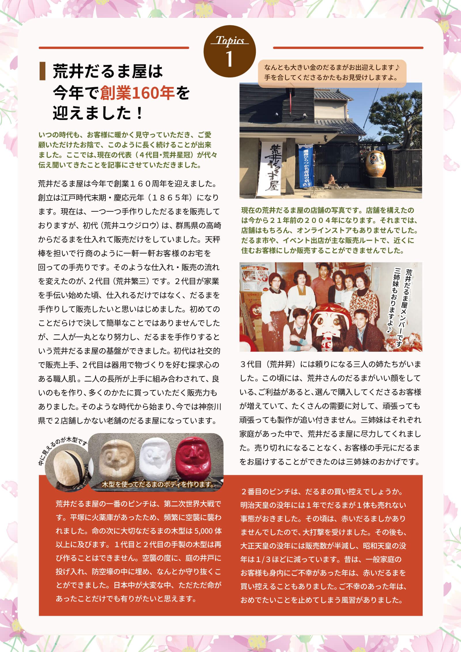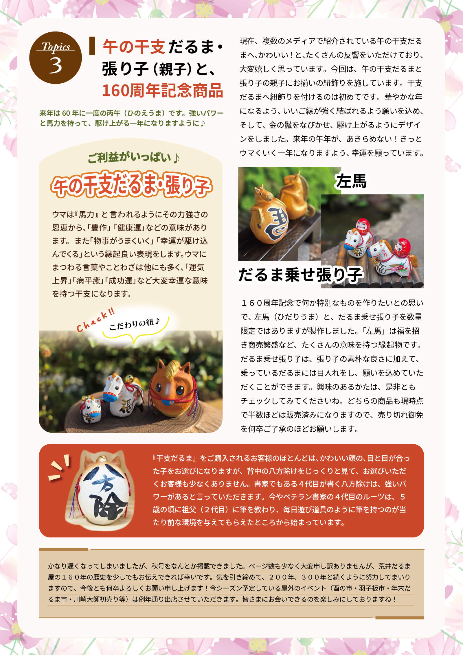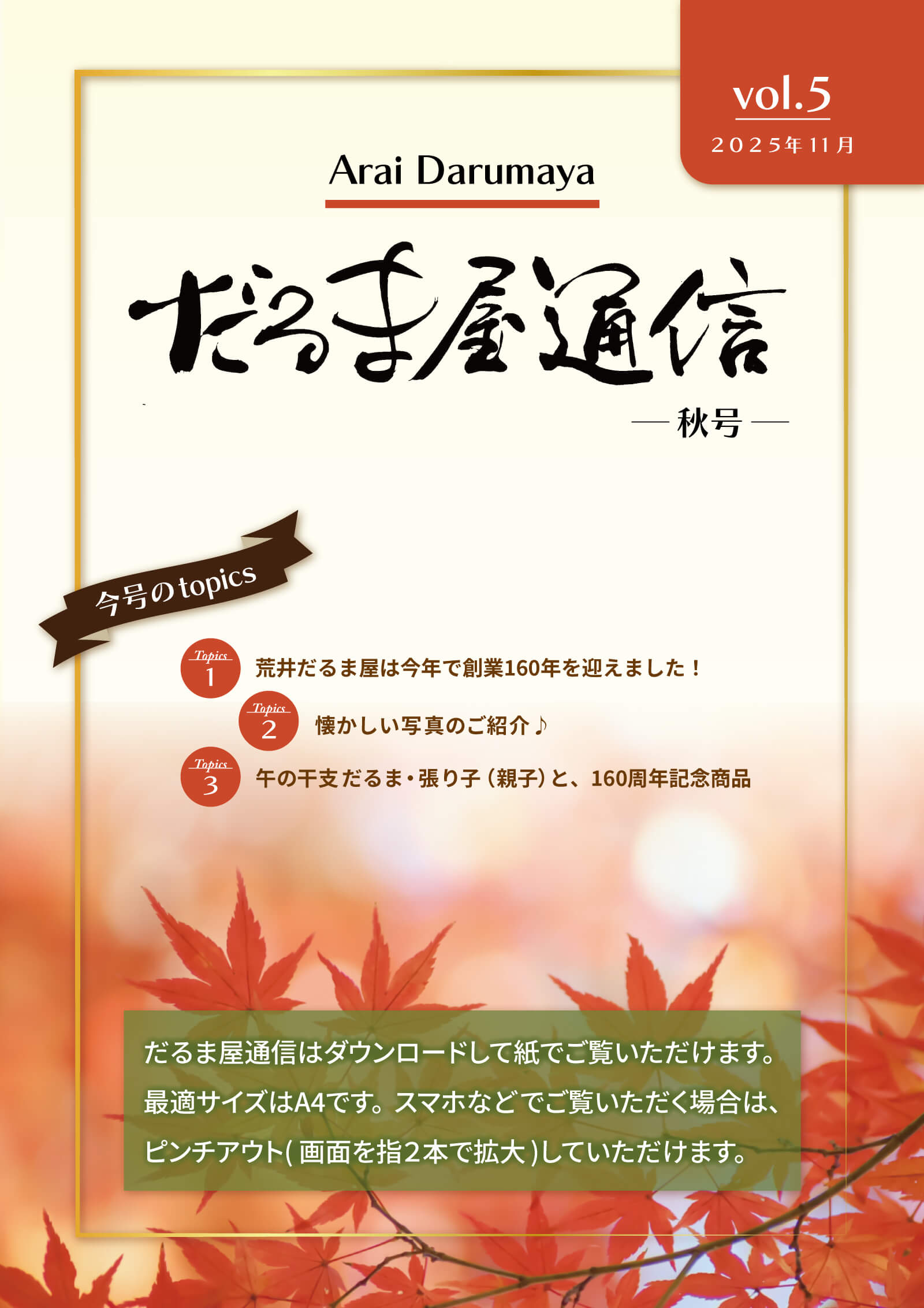 だるま屋通信・2025年秋号をご覧ください。 2025.11.09 投稿, だるま屋通信 お客様で出力していただき、紙でご覧いただけます。スマホなどでご覧いただく場合は、ピンチアウト(画面を指2本で拡大)していただけます。 ▼ 印刷はこちらから ご覧いただきありがとうございました。 Tweet Share Hatena Pocket feedly Pin it RSS 現在オンラインストアでクレジット決済ができません 関連記事 緑化まつりで絵付け体験を実施します♪ だるま屋通信・2024年夏号をご覧ください。 FMヨコハマ・トレセン番組内の『こだわりびとをたずねて』で対談しました! 2023_必勝・選挙だるまの製作がピークを迎えております