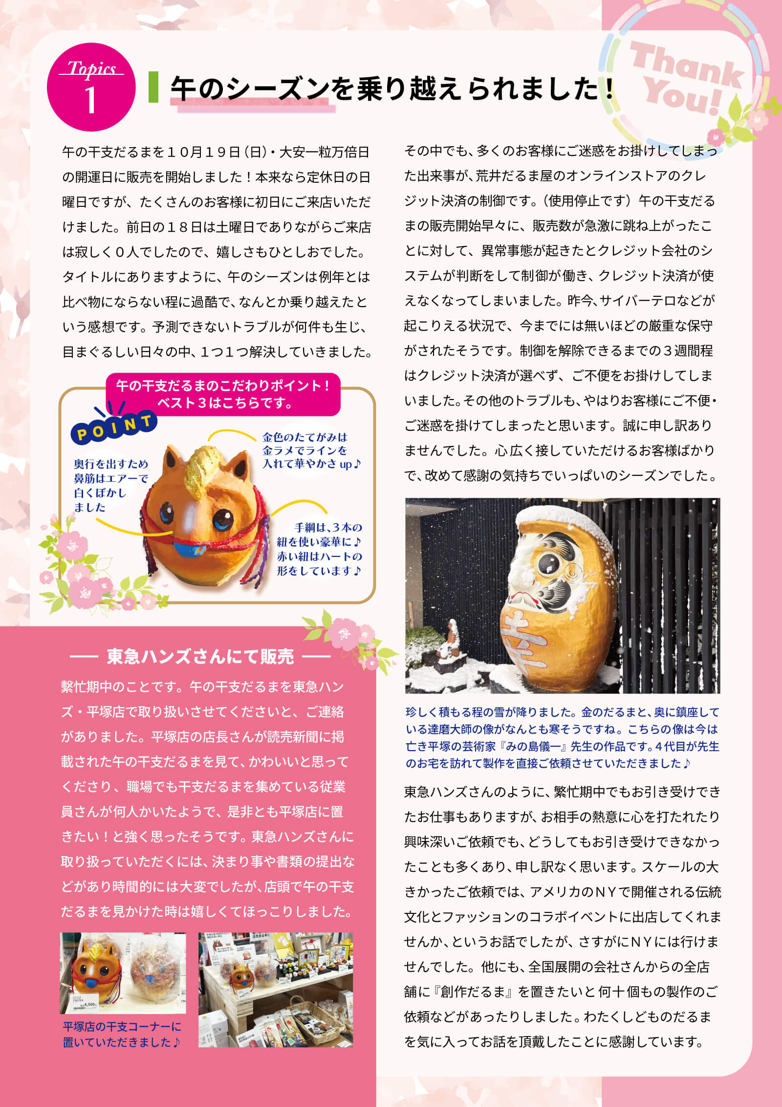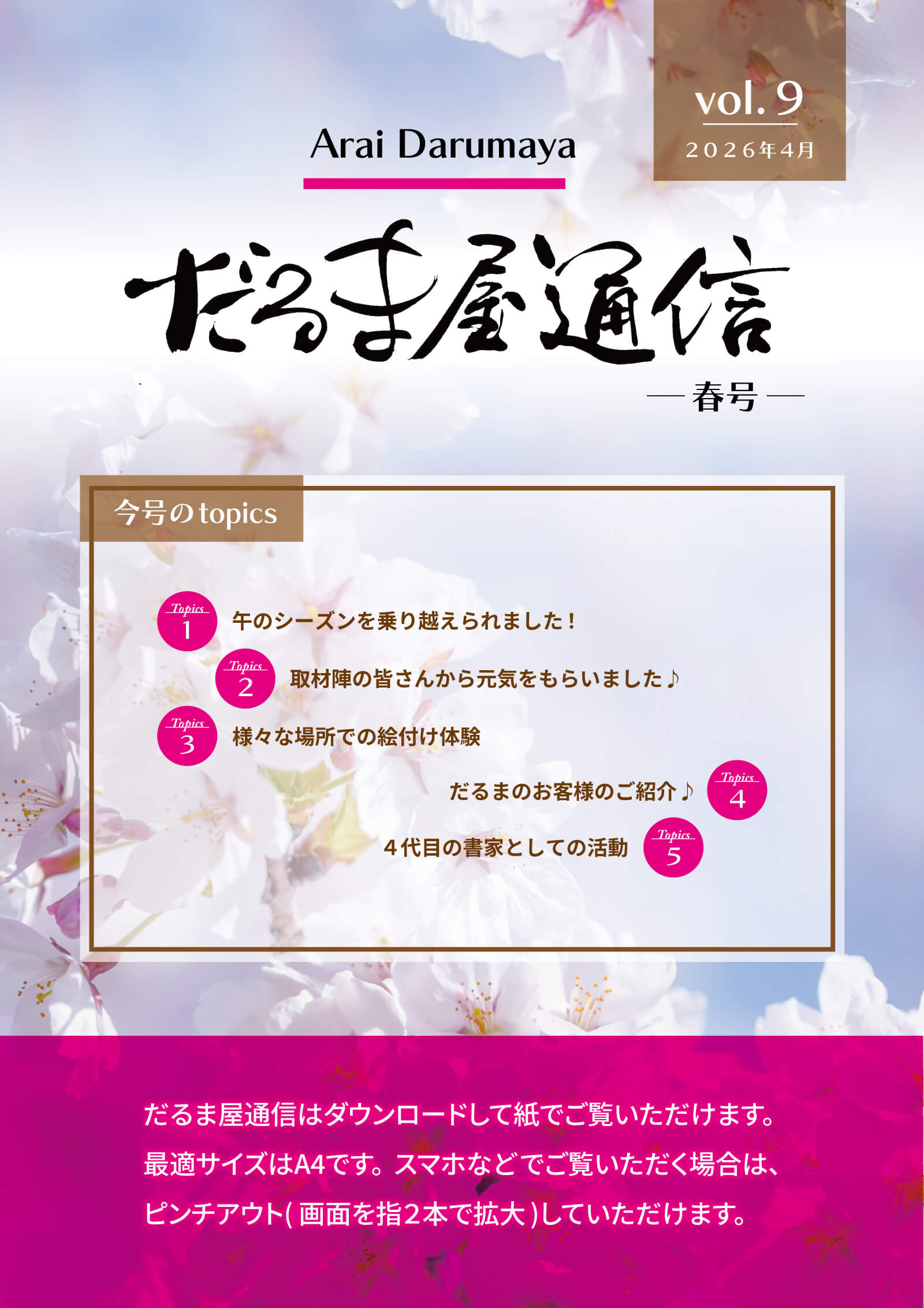 だるま屋通信・2026年春号をご覧ください。 2026.04.17 投稿, だるま屋通信 お客様で出力していただき、紙でご覧いただけます。スマホなどでご覧いただく場合は、ピンチアウト(画面を指2本で拡大)していただけます。 ▼ 印刷はこちらから ご覧いただきありがとうございました。 Tweet Share Hatena Pocket feedly Pin it RSS だるま屋通信・2026年冬号をご覧ください。 関連記事 だるま屋通信・2024年春号をご覧ください! だるま屋通信・2024年秋号をご覧ください。 だるま屋通信・2024年夏号をご覧ください。 2025年_酉の市_浅草