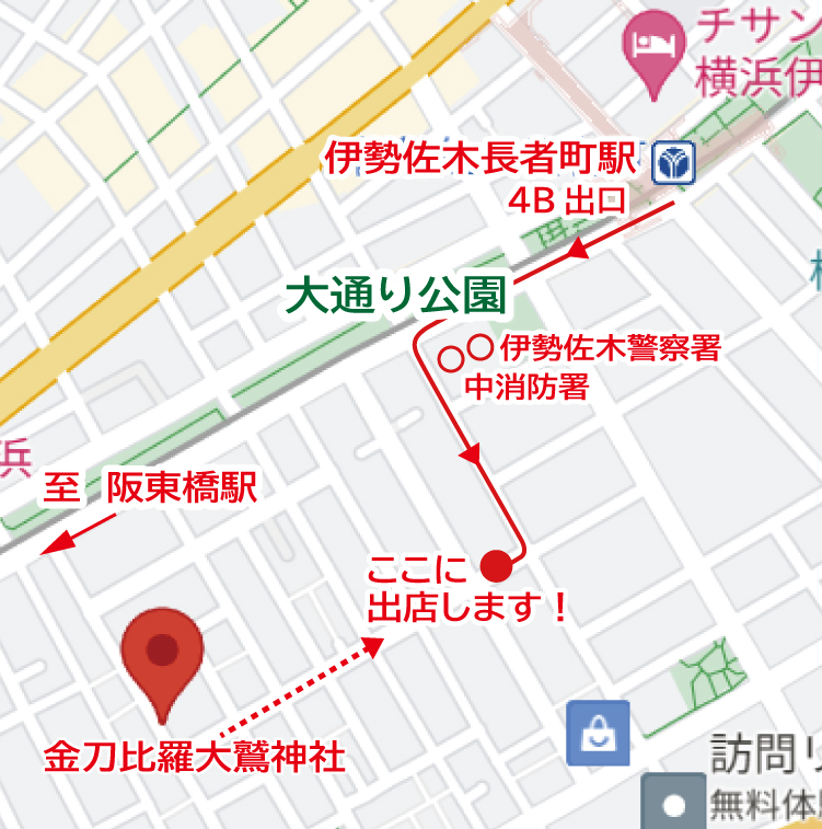 伊勢佐木長者町駅の4B出口より、大通り公園沿いに阪東橋駅方面に歩き、